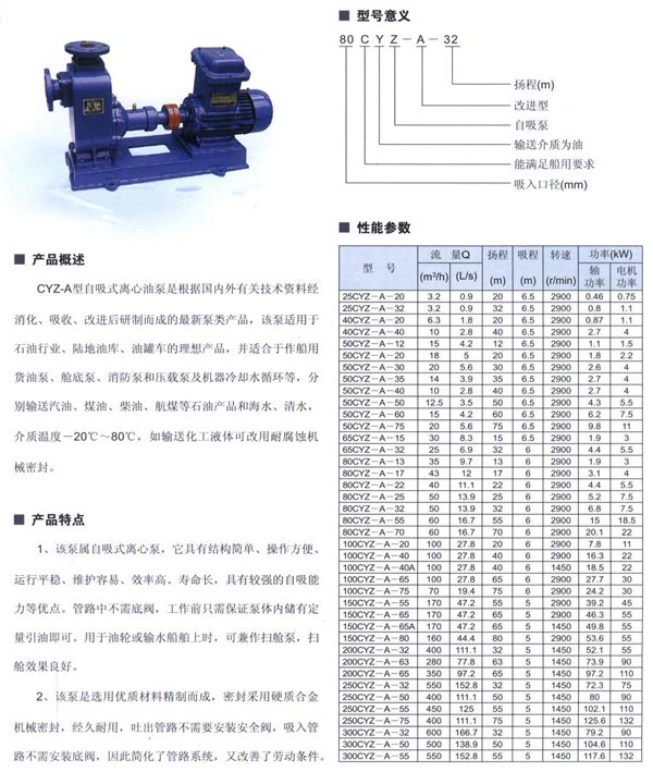 CYZ自吸离心油泵是根据国内外有关技术资料经消化、吸收、改进后研制而成的新泵类产品,该泵适用于石油行业、陆地油库、油罐车的理想产品,并适合于作船用货油泵、舱底泵、消防泵和压载泵及机器冷却水循环等,分别输送汽油、煤油、柴油、航煤等石油产品和海水、清水,介质温度-20℃-80℃,如输送化工液体可改用耐腐蚀机械密封。